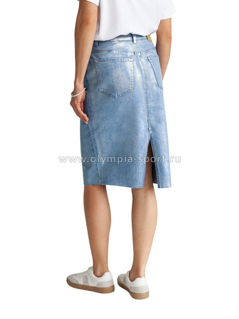 Юбка выполнена из эластичного денима. Сверху изделия нанесено стойкое, но при этом мягкое металлизированное покрытие с декоративными потёртостями. Модель прямого кроя чуть ниже колен с трендовым открытым срезом и пятью карманами как у джинс внесет яркий акцент любому образу.